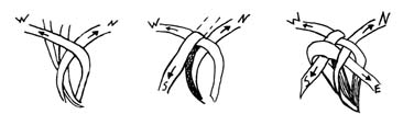 Beginning at about 2" from the base, fold one leaf back, slanting 45° to the left (1), fold the other leaf back, again at a 45° angle under it (2), fold the first under again continuing in in a counter-clockwise motion, bringing the "rose" as it is now appearing, over the front of the stem (3). Since the palm is tapered, the rose begins to become smaller as you continue. When you feel you have a nice rose, secure the center with a pin or inserting the ends into the weave. You can either trim the ends, or let ends spin off. The center of the rose can be decorated with sequins, a tiny ribbon, or just a knot. It does not need to be decorated if done well. Roses look nice alone or in a bouquet of roses. A palm rose bouquet is welcome as a gift to the person who has everything money can buy! If hung on the wall, the roses can open and hang down, forming a nice spiral. Some leave the folds tufted, not pulled tight, for a rounded effect.